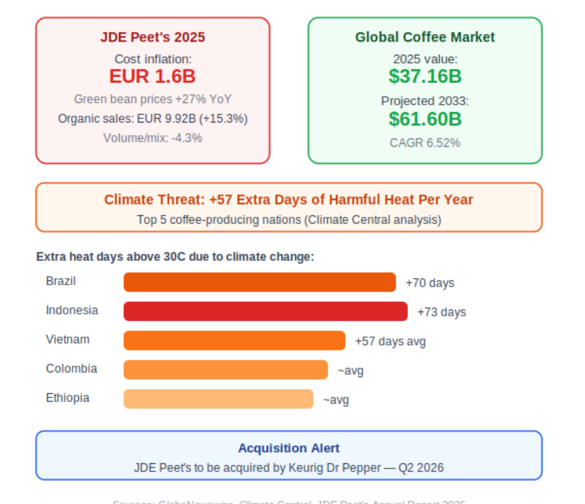 One of the world’s largest coffee companies is feeling the full weight of a commodity market in crisis. JDE Peet’s, the company behind brands such as Douwe Egberts, Peet’s Coffee, and Jacobs, reported that its 2025 operating results were severely impacted by unprecedented green coffee bean price inflation rising 27 percent year over year, generating […]