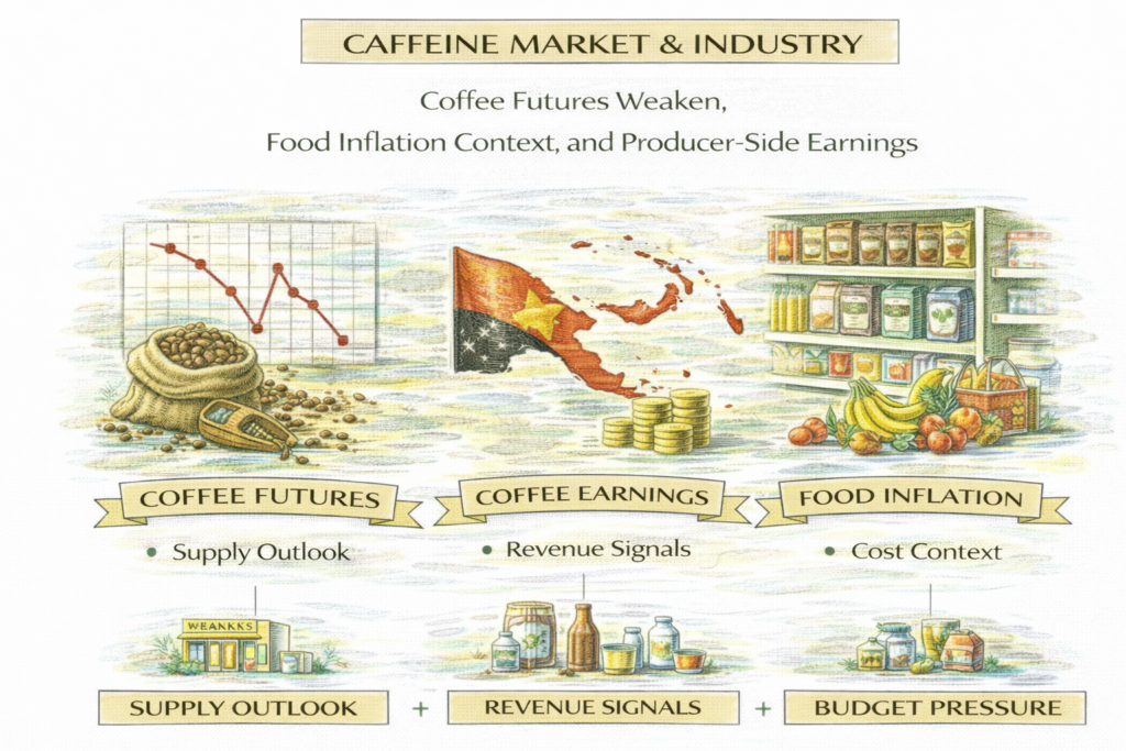 Caffeine Market & Industry — Coffee Futures Weaken, Food Inflation Context, and Producer-Side Earnings