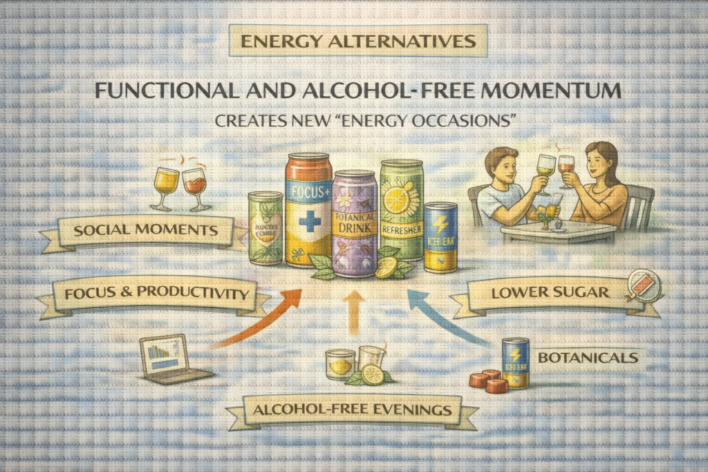 Within the past 24 hours (ET), Trade Magazin referenced IWSR insights indicating growing demand for alcohol-free and functional beverages. For the caffeine ecosystem, this matters because “energy” increasingly competes with alcohol as an effect-driven purchase: consumers still want a noticeable experience, but not necessarily intoxication. That opens up new spaces for alternatives that feel adult and purposeful—functional sparkling drinks, […]